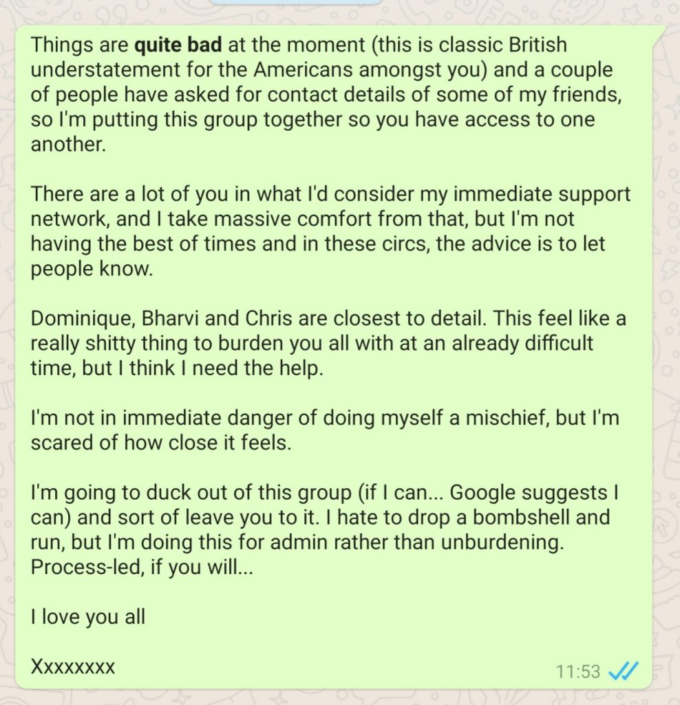 Without really knowing why, I quickly set up a WhatsApp group of around 20 of my closest friends. Each of these I’ve always known I could call at 4am and they’d drop whatever they needed to help. I have the luxury of picking from a much longer list and it strikes me once again that someone with this many genuinely incredible friends shouldn’t feel as lonely as I do. But mind works the way the mind works, I guess…